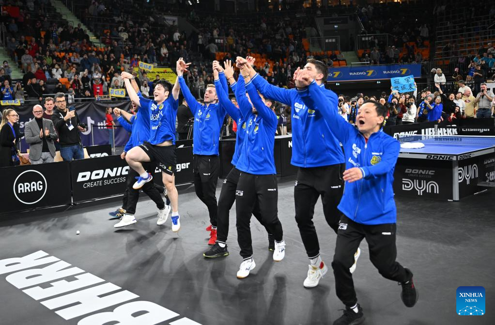 Members of 1. FC Saarbrucken Tischtennis celebrate victory after the final between 1. FC Saarbrucken Tischtennis and TTC RhonSprudel Fulda-Maberzell of Liebherr Pokal table tennis tournament in Neu-Ulm, Germany, Jan. 4, 2026. (Photo by Ulrich Hufnagel/Xinhua)