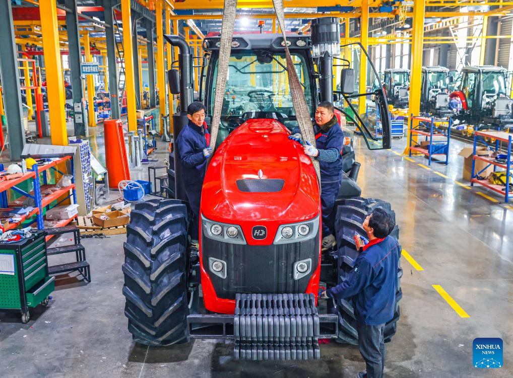 Workers assemble a smart tractor in Yangzhou, east China's Jiangsu Province, Jan. 5, 2026. At the start of 2026, businesses across China are already busy fulfilling orders and ramping up production, aiming for a sound performance in the first quarter. (Photo by Ren Fei/Xinhua)