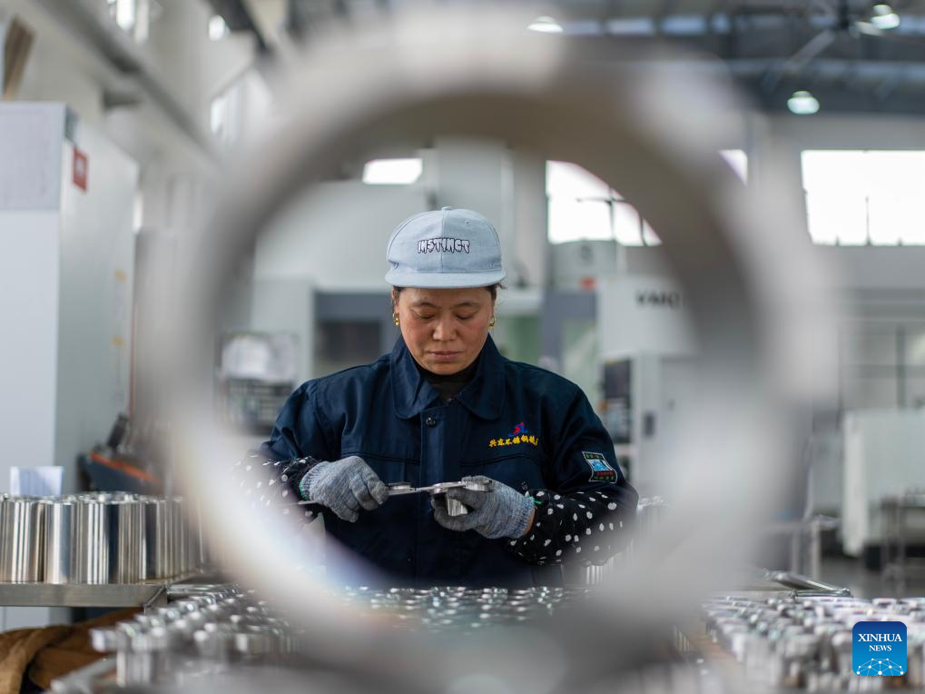A worker checks products at the workshop of a stainless steel company in Dainan Town, Xinghua City, east China's Jiangsu Province, Jan. 5, 2026. At the start of 2026, businesses across China are already busy fulfilling orders and ramping up production, aiming for a sound performance in the first quarter. (Photo by Zhou Shegen/Xinhua)