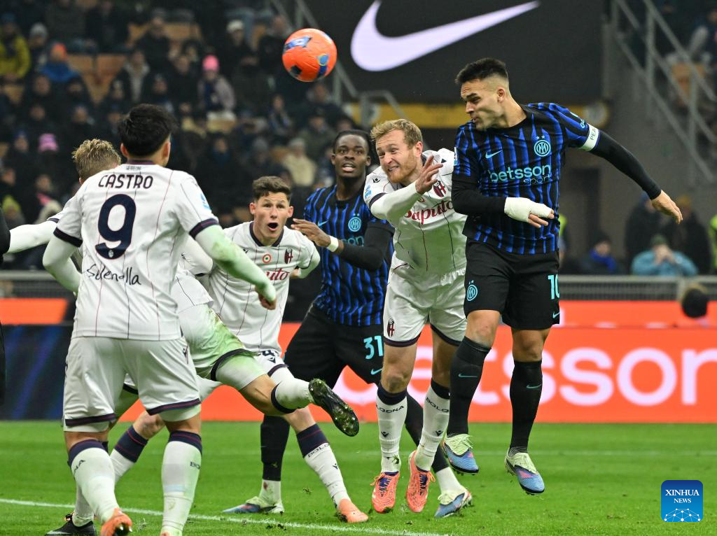 Inter Milan's Lautaro Martinez (1st R) heads to score during a Serie A football match between Inter Milan and Bologna in Milan, Italy, Jan. 4, 2026. (Photo by Alberto Lingria/Xinhua)