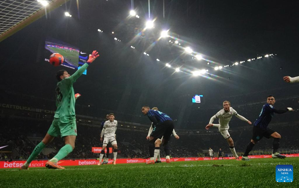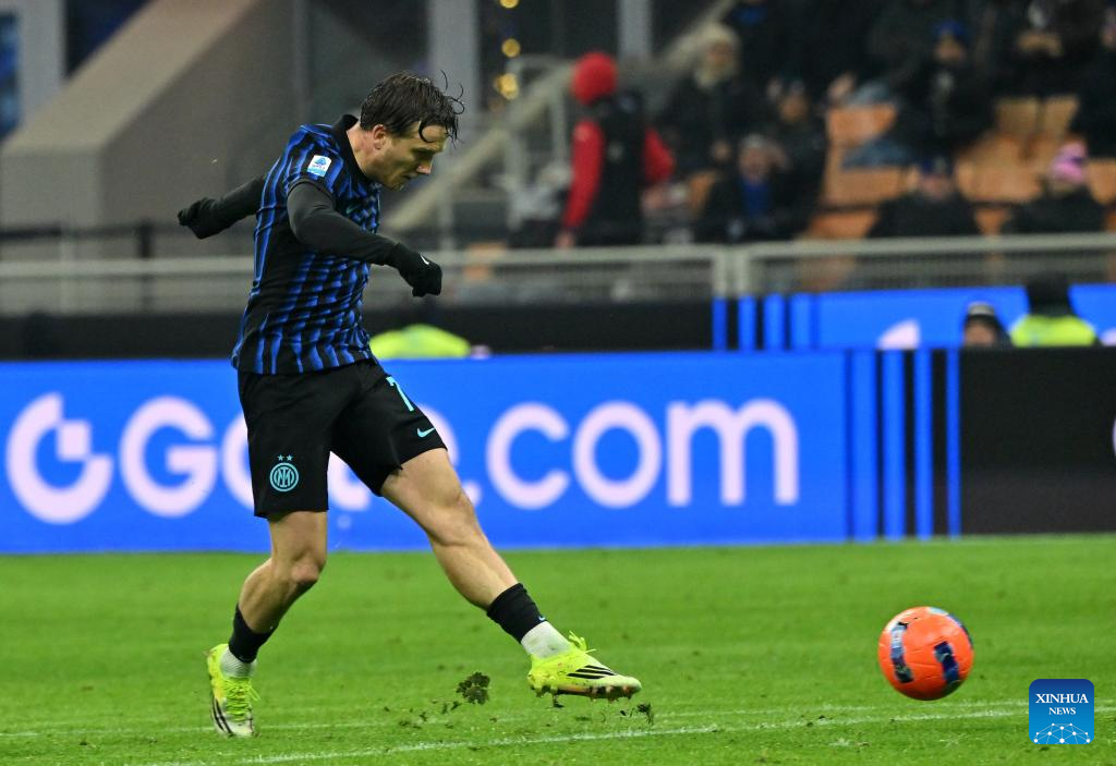 Inter Milan's Piotr Zielinski shoots and scores during a Serie A football match between Inter Milan and Bologna in Milan, Italy, Jan. 4, 2026. (Photo by Alberto Lingria/Xinhua)