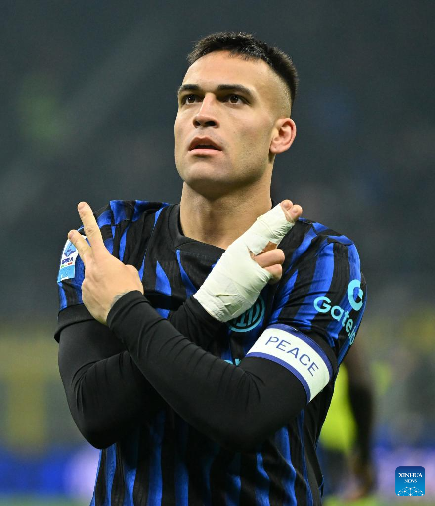 Inter Milan's Lautaro Martinez celebrates his goal during a Serie A football match between Inter Milan and Bologna in Milan, Italy, Jan. 4, 2026. (Photo by Alberto Lingria/Xinhua)