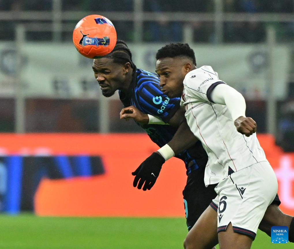 Inter Milan's Marcus Thuram (L) vies with Bologna's Jhon Lucumi during a Serie A football match between Inter Milan and Bologna in Milan, Italy, Jan. 4, 2026. (Photo by Alberto Lingria/Xinhua)