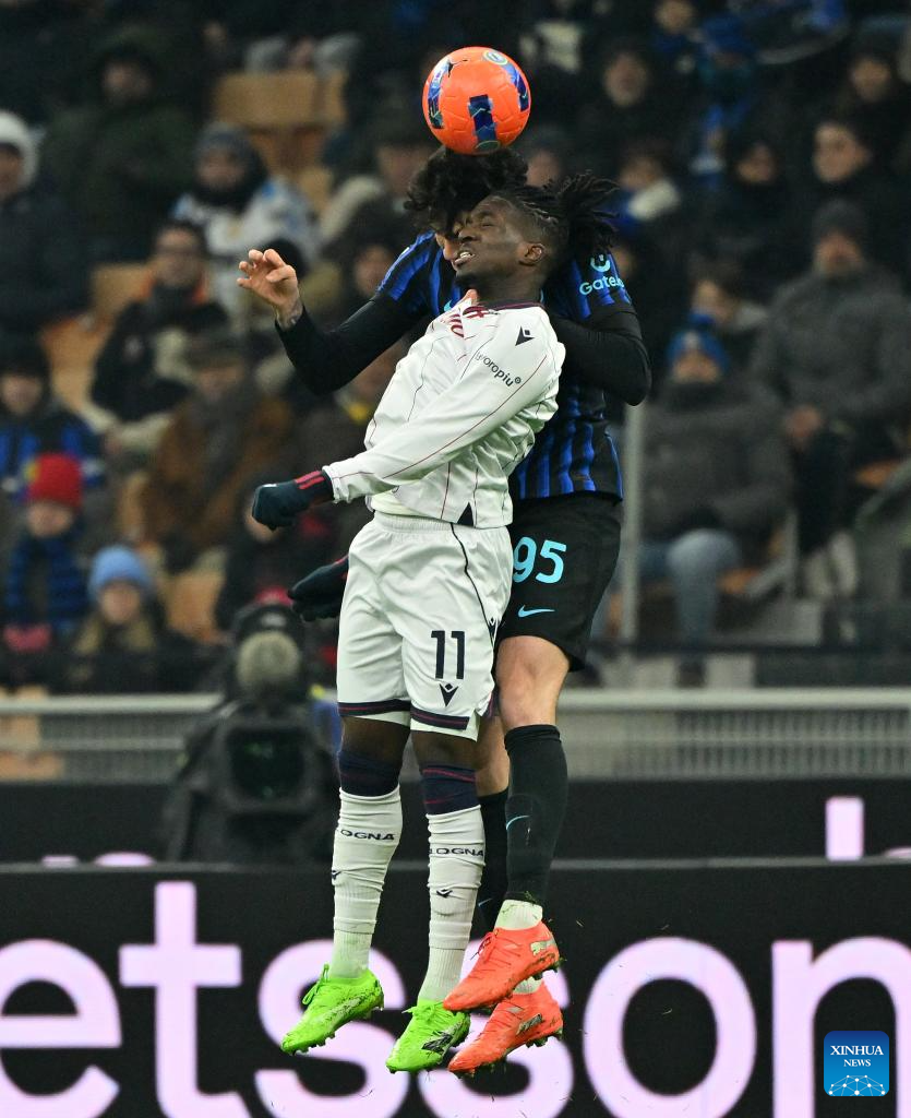 Inter Milan's Alessandro Bastoni (R) vies with Bologna's Jonathan Rowe during a Serie A football match between Inter Milan and Bologna in Milan, Italy, Jan. 4, 2026. (Photo by Alberto Lingria/Xinhua)
