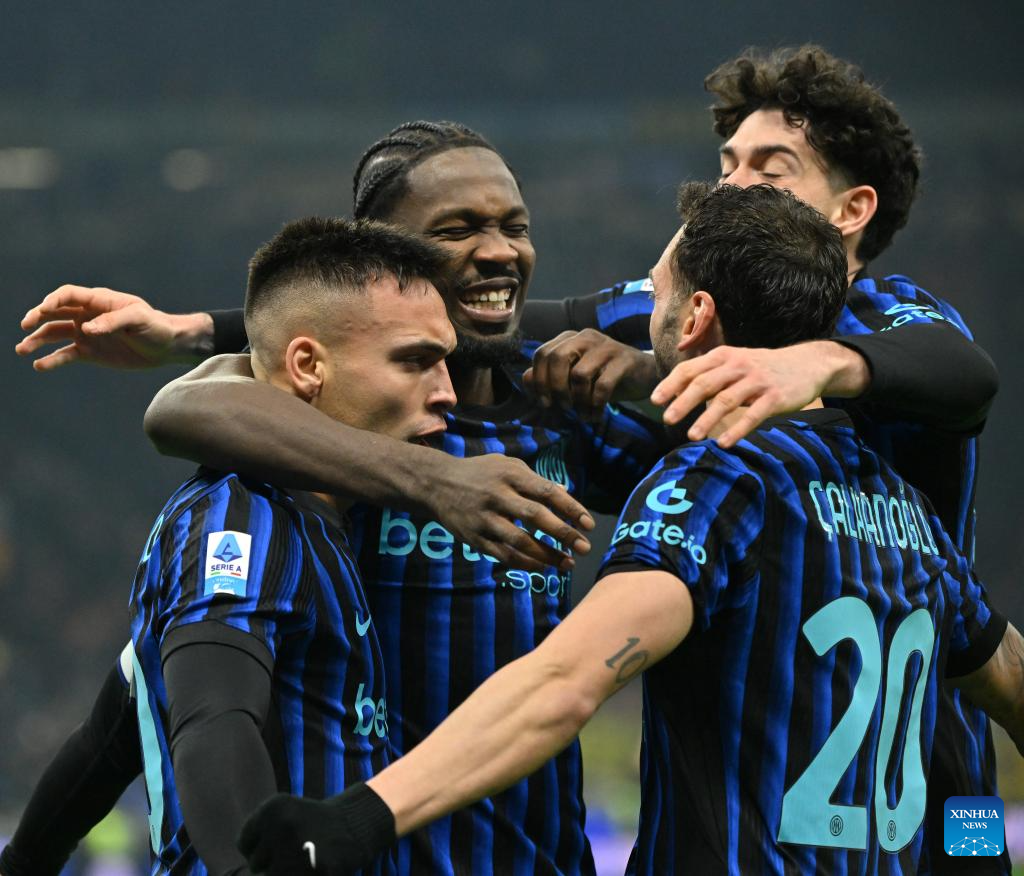 Inter Milan's Lautaro Martinez (L) celebrates his goal with his teammates during a Serie A football match between Inter Milan and Bologna in Milan, Italy, Jan. 4, 2026. (Photo by Alberto Lingria/Xinhua)