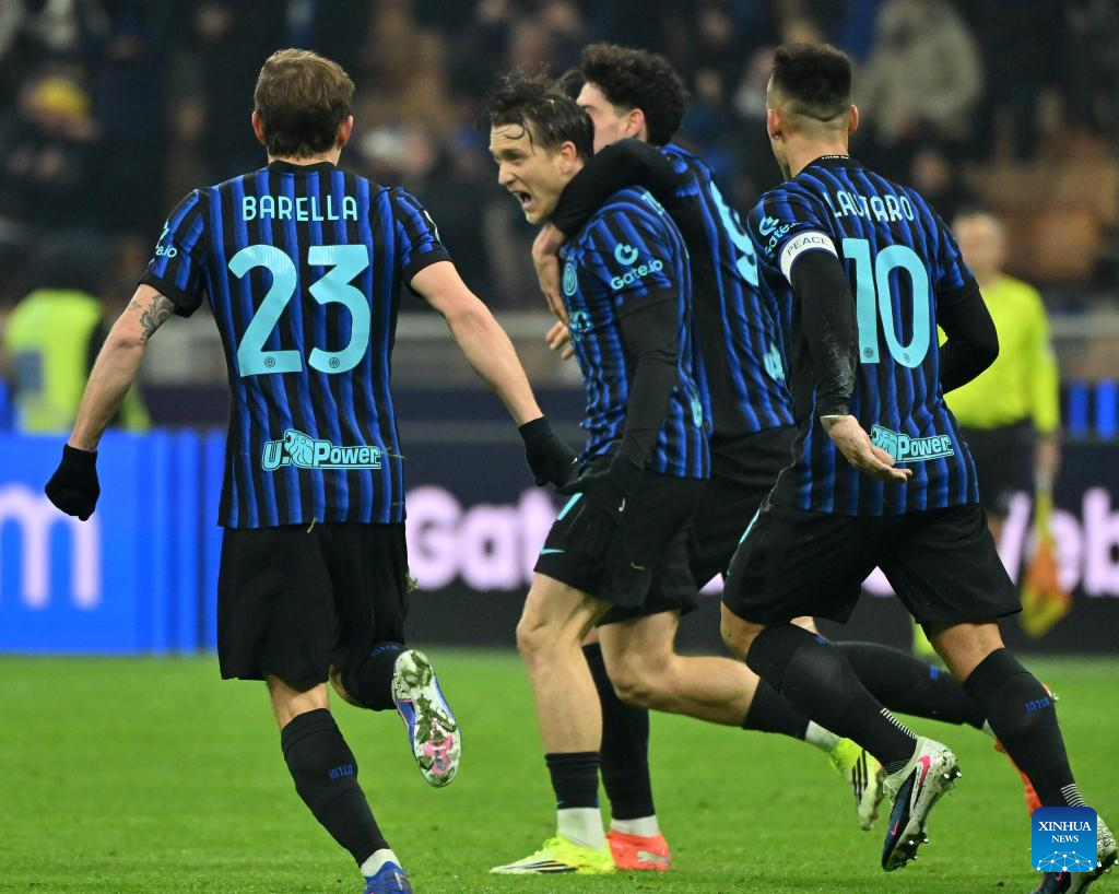 Inter Milan's Piotr Zielinski (2nd L) celebrates his goal with his teammates during a Serie A football match between Inter Milan and Bologna in Milan, Italy, Jan. 4, 2026. (Photo by Alberto Lingria/Xinhua)