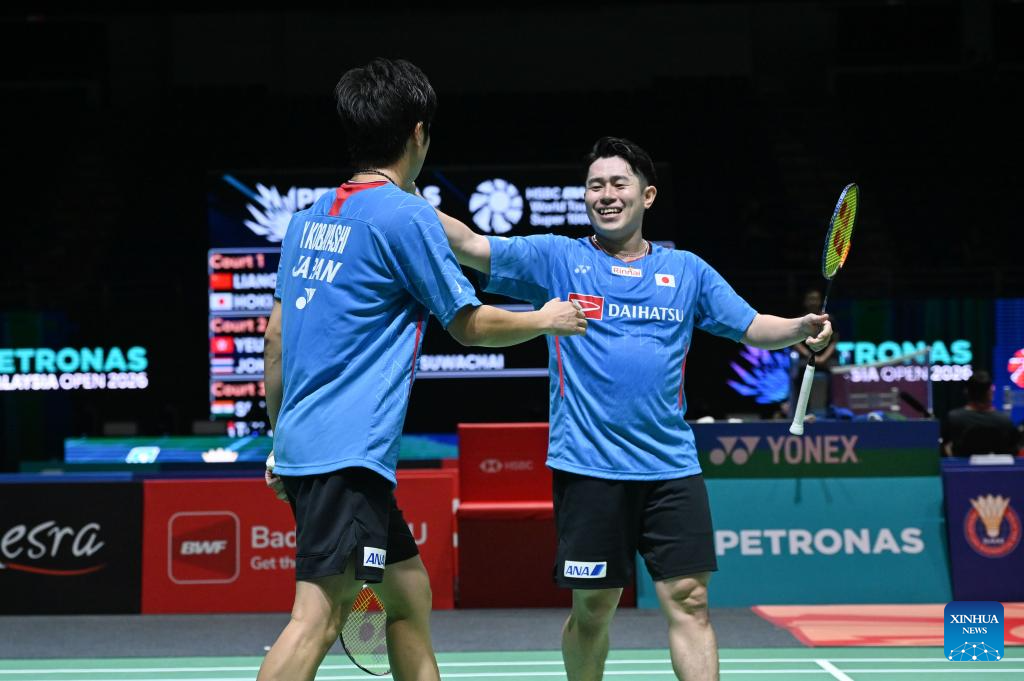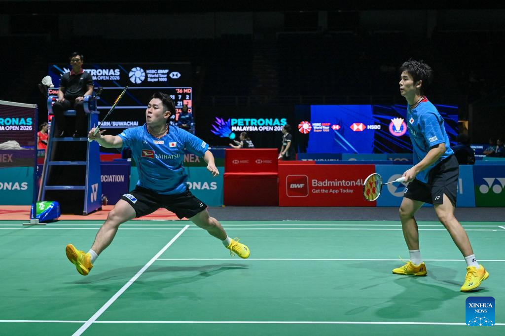 Hoki Takuro/Kobayashi Yugo(R) of Japan compete during the men's doubles round of 32 match against Liang Weikeng/Wang Chang of China at the Malaysia Open 2026 badminton tournament in Kuala Lumpur, Malaysia, Jan. 6, 2026. (Photo by Chong Voon Chung/Xinhua)