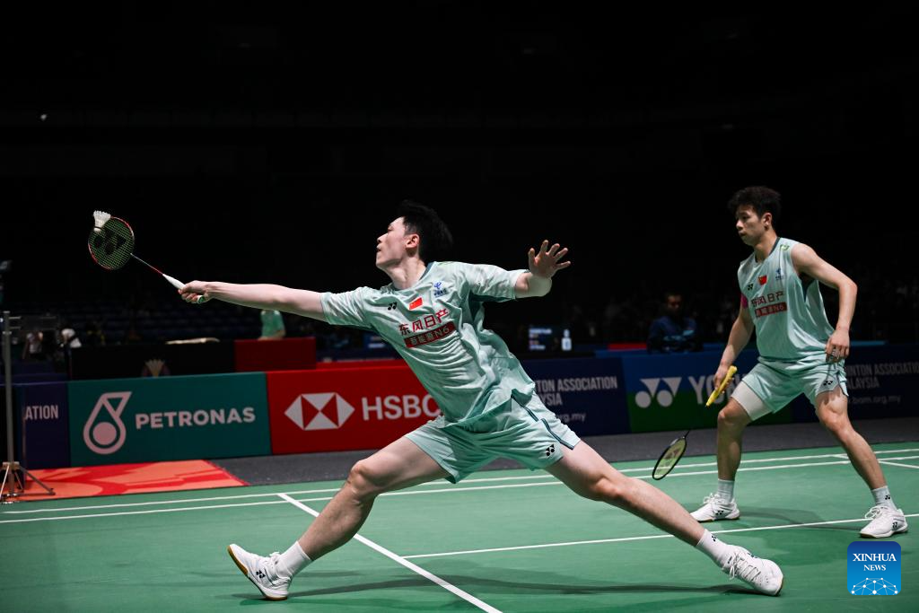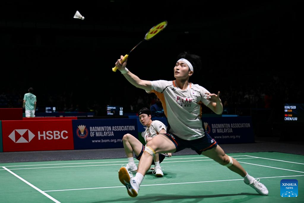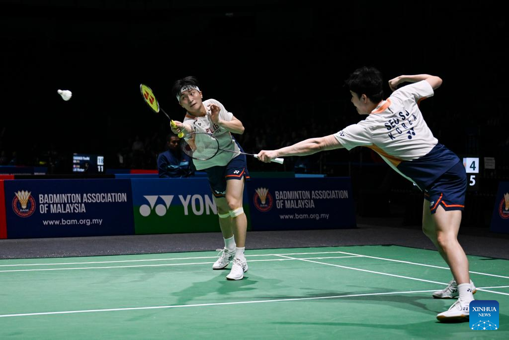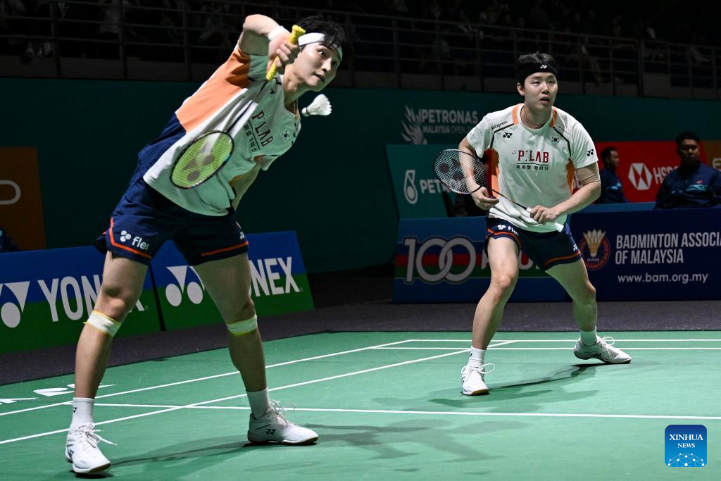 Kim Won Ho (L)/Seo Seung Jae of South Korea compete during the men's doubles round of 32 match against Chen Boyang/Liu Yi of China at the Malaysia Open 2026 badminton tournament in Kuala Lumpur, Malaysia, Jan. 6, 2026. (Xinhua/Cheng Yiheng)