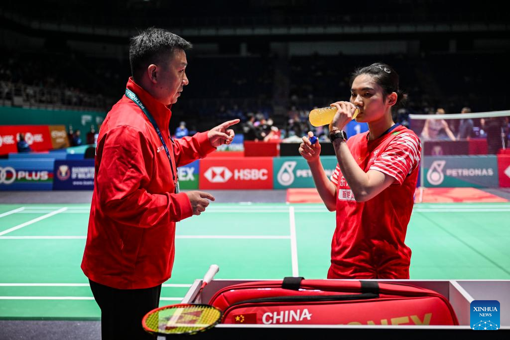 Han Yue (R) listens to her coach during the women's singles round of 32 match between Han Yue of China and Kim Ga Eun of South Korea at the Malaysia Open 2026 badminton tournament in Kuala Lumpur, Malaysia, Jan. 6, 2026. (Xinhua/Cheng Yiheng)