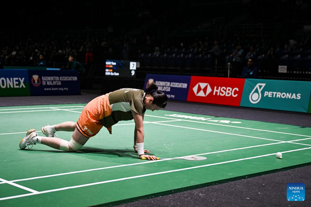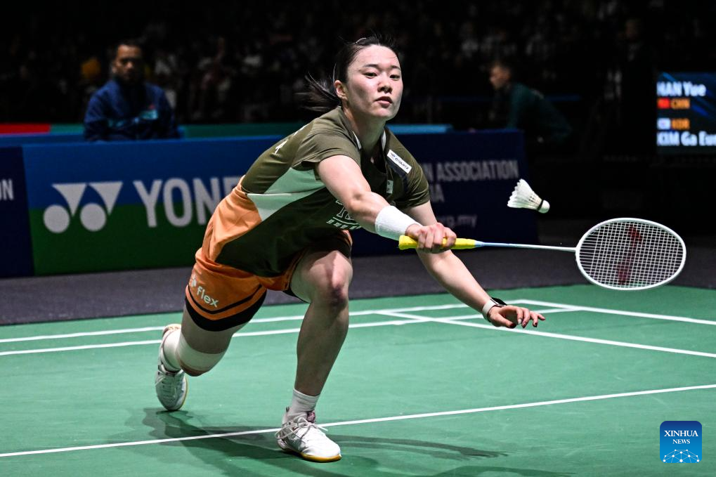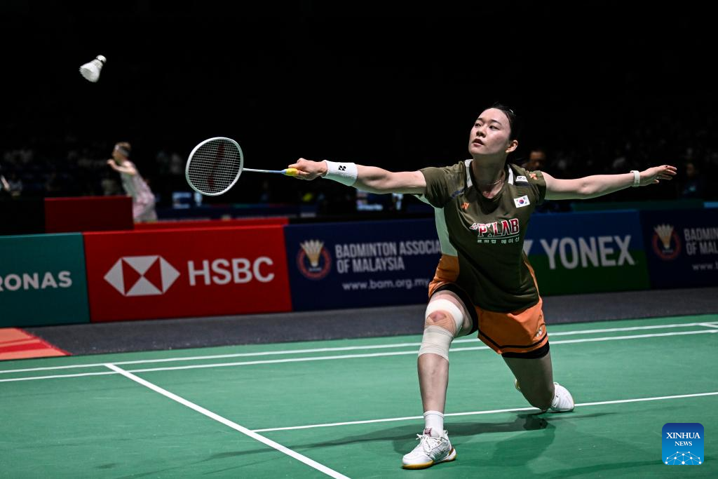Kim Ga Eun competes during the women's singles round of 32 match between Han Yue of China and Kim Ga Eun of South Korea at the Malaysia Open 2026 badminton tournament in Kuala Lumpur, Malaysia, Jan. 6, 2026. (Xinhua/Cheng Yiheng)
