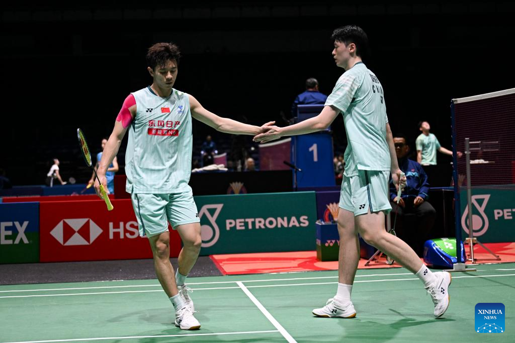 Chen Boyang/Liu Yi (L) of China celebrate a score during the men's doubles round of 32 match against Kim Won Ho/Seo Seung Jae of South Korea at the Malaysia Open 2026 badminton tournament in Kuala Lumpur, Malaysia, Jan. 6, 2026. (Xinhua/Cheng Yiheng)