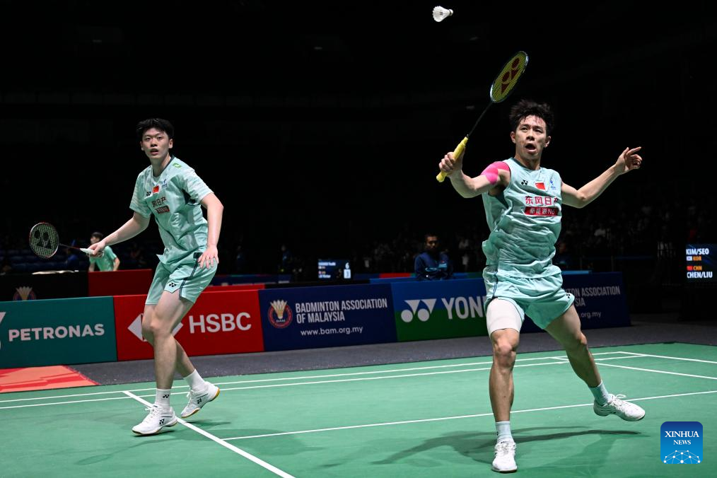 Chen Boyang/Liu Yi (R) of China compete during the men's doubles round of 32 match against Kim Won Ho/Seo Seung Jae of South Korea at the Malaysia Open 2026 badminton tournament in Kuala Lumpur, Malaysia, Jan. 6, 2026. (Xinhua/Cheng Yiheng)