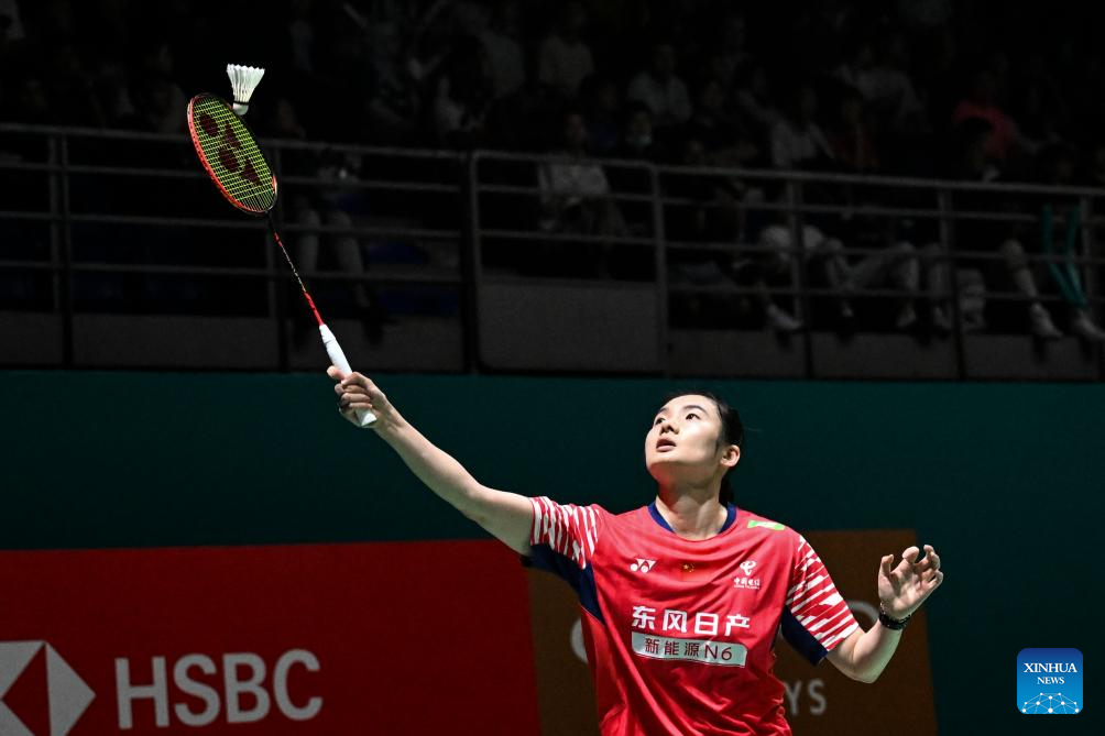 Han Yue competes during the women's singles round of 32 match between Han Yue of China and Kim Ga Eun of South Korea at the Malaysia Open 2026 badminton tournament in Kuala Lumpur, Malaysia, Jan. 6, 2026. (Xinhua/Cheng Yiheng)