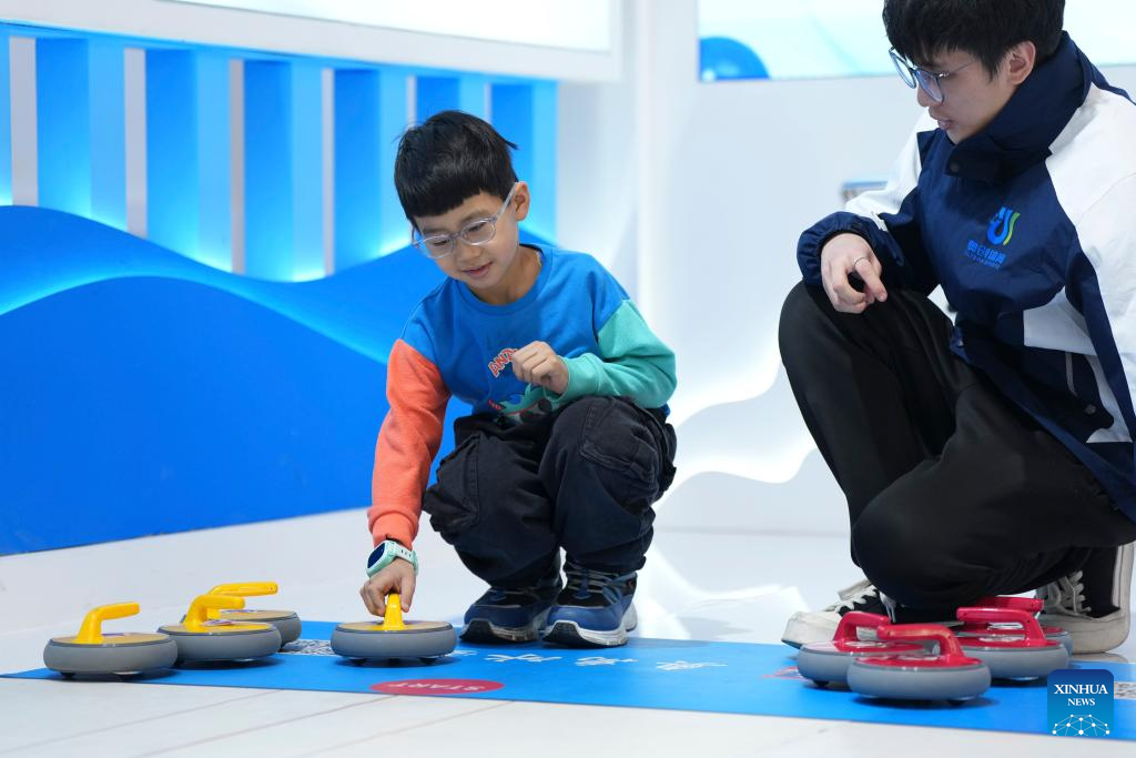 Visitors play curling at the Harbin International Ice and Snow Economy Expo 2026 in Harbin, northeast China's Heilongjiang Province, Jan. 6, 2026. The three-day expo kicked off here on Tuesday, showcasing cutting-edge achievements of the ice-and-snow industry. (Xinhua/Zhang Tao)