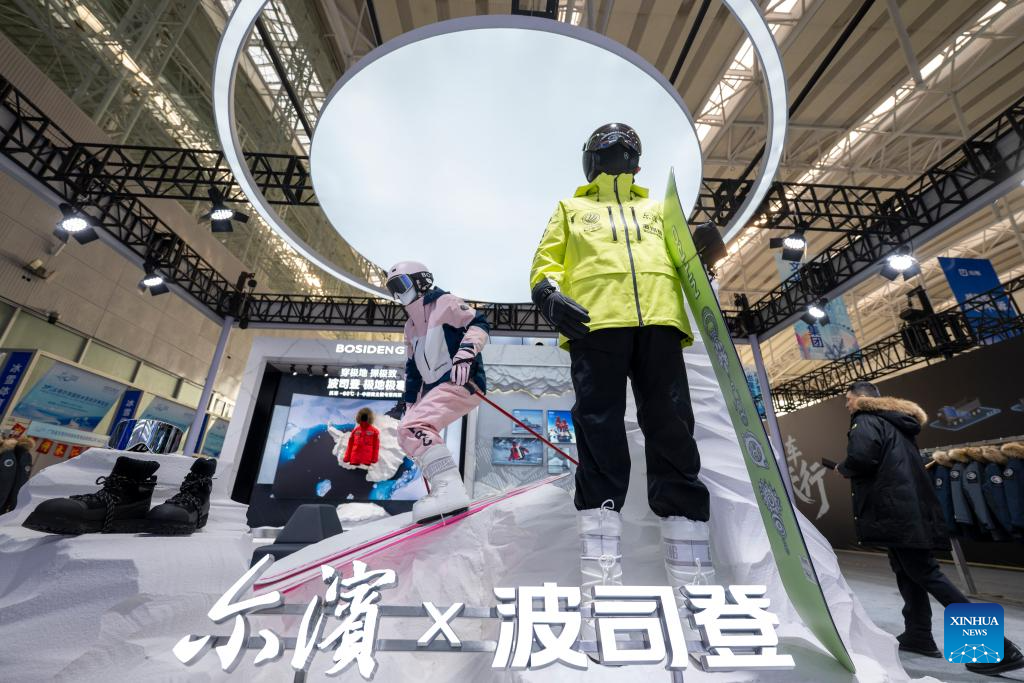 A guest checks out a snowboard at the Harbin International Ice and Snow Economy Expo 2026 in Harbin, northeast China's Heilongjiang Province, Jan. 6, 2026. The three-day expo kicked off here on Tuesday, showcasing cutting-edge achievements of the ice-and-snow industry. (Xinhua/Zhang Tao)