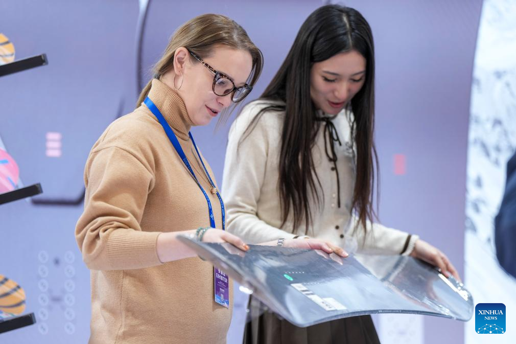Visitors communicate at the Harbin International Ice and Snow Economy Expo 2026 in Harbin, northeast China's Heilongjiang Province, Jan. 6, 2026. The three-day expo kicked off here on Tuesday, showcasing cutting-edge achievements of the ice-and-snow industry. (Xinhua/Zhang Tao)