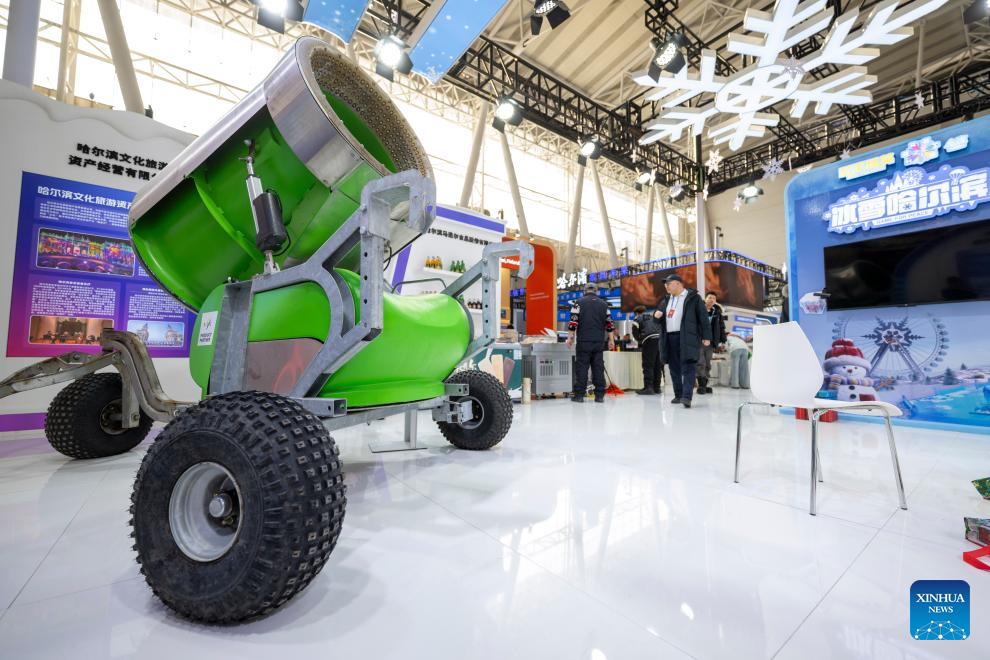 This photo shows a snow-making machine exhibited at the Harbin International Ice and Snow Economy Expo 2026 in Harbin, northeast China's Heilongjiang Province, Jan. 6, 2026. The three-day expo kicked off here on Tuesday, showcasing cutting-edge achievements of the ice-and-snow industry. (Xinhua/Wang Song)