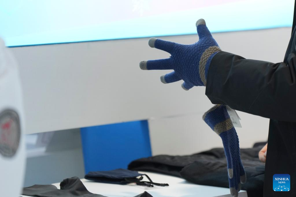 A visitor tries a pair of graphene gloves at the Harbin International Ice and Snow Economy Expo 2026 in Harbin, northeast China's Heilongjiang Province, Jan. 6, 2026. The three-day expo kicked off here on Tuesday, showcasing cutting-edge achievements of the ice-and-snow industry. (Xinhua/Wang Song)