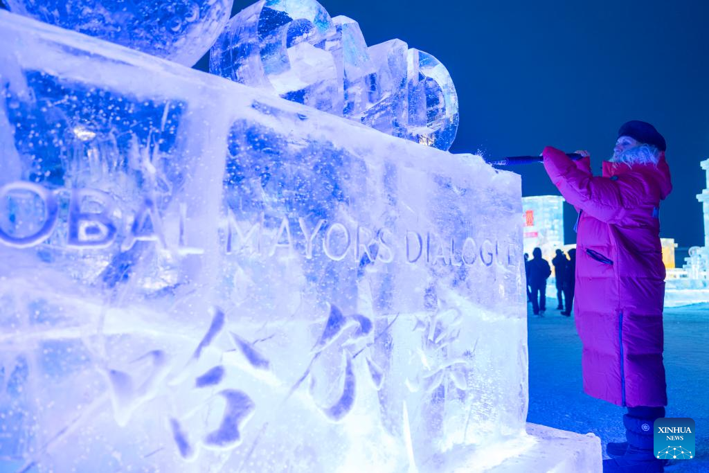 A delegate to the "Global Mayors Dialogue in Harbin" tries her hands trimming an ice sculpture after the opening ceremony of the dialogue in Harbin, northeast China's Heilongjiang Province, Jan. 6, 2026. The opening ceremony of the dialogue was held at the Harbin Ice-Snow World here on Tuesday. (Xinhua/Zhang Tao)