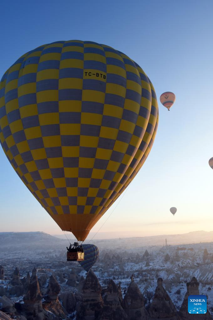 A hot air balloon flies over Cappadocia region in Türkiye on Jan. 4, 2026. A new visa-free regime for Chinese citizens is fueling expectations for a tourism boom in Türkiye, as industry operators predict the easier entry will lead to longer stays and deeper cultural ties.(Mustafa Kaya/Handout via Xinhua)