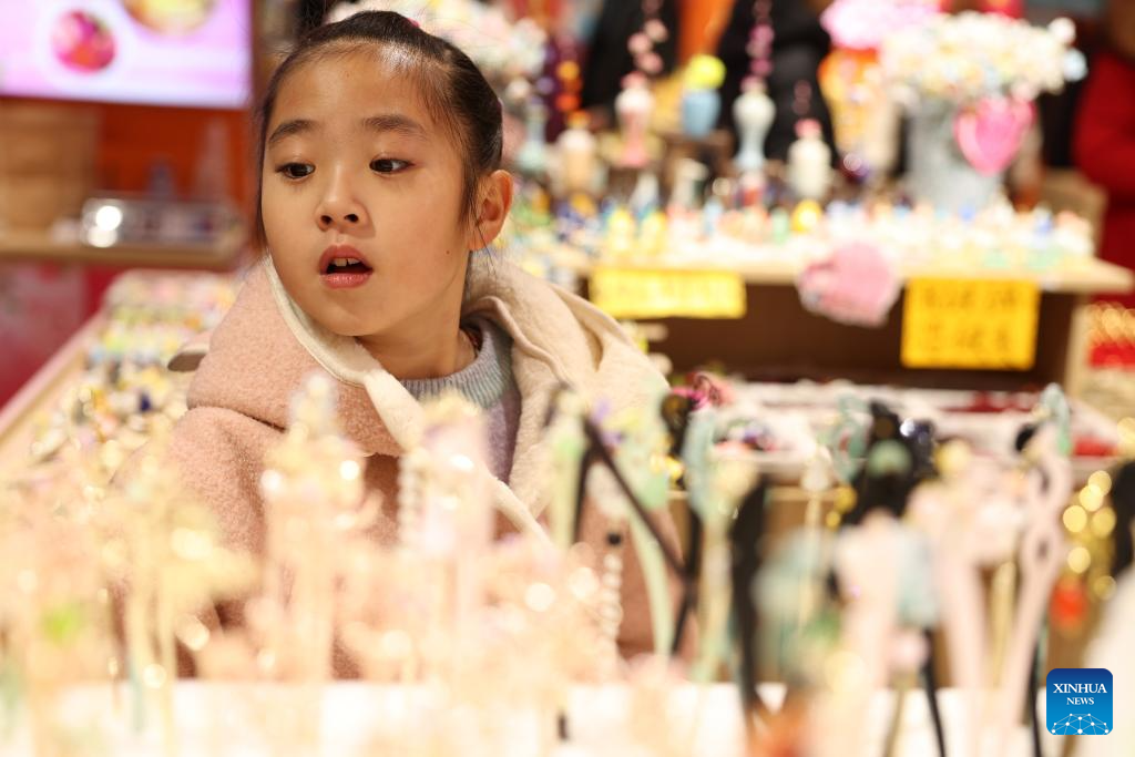 A girl selects accessories at a store in Qilihe District of Lanzhou, northwest China's Gansu Province, on Jan. 6, 2026. At the beginning of the new year, Lanzhou has been actively creating a festive atmosphere and promoting the upgrading of mature business districts and characteristic streets in the urban area. A series of new products and services has been launched to boost the consumption. (Xinhua/Chen Bin)