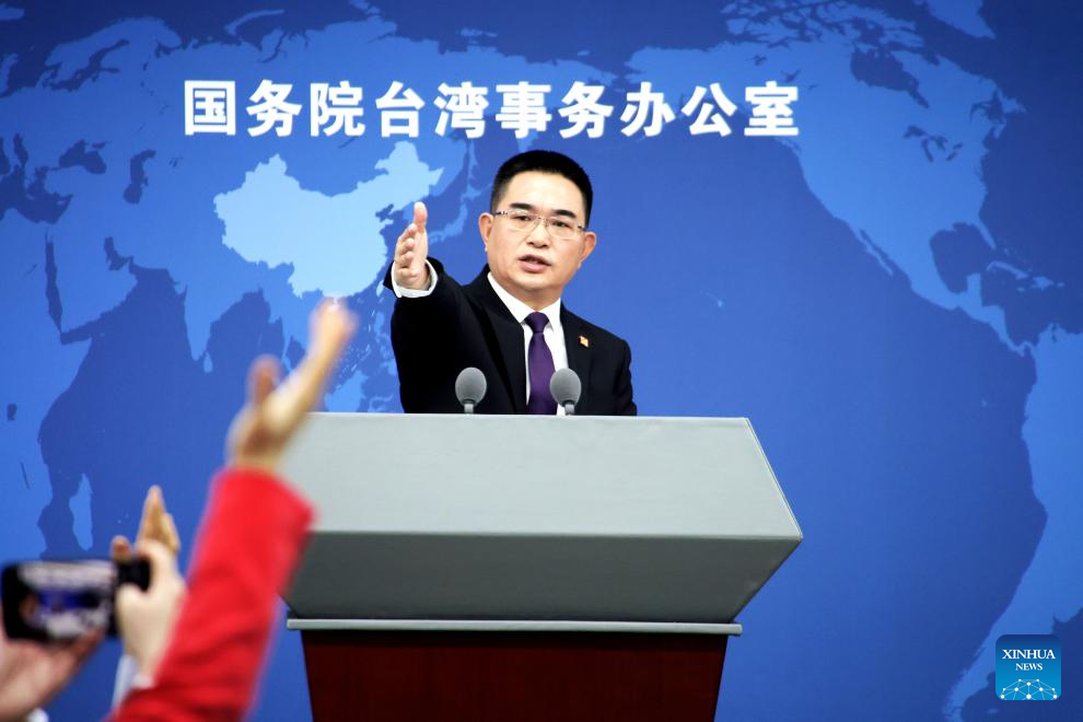 Chen Binhua, a spokesperson for the Taiwan Affairs Office of the State Council, gestures at a press conference in Beijing, capital of China, Jan. 7, 2026. (Xinhua/Pan Xu)