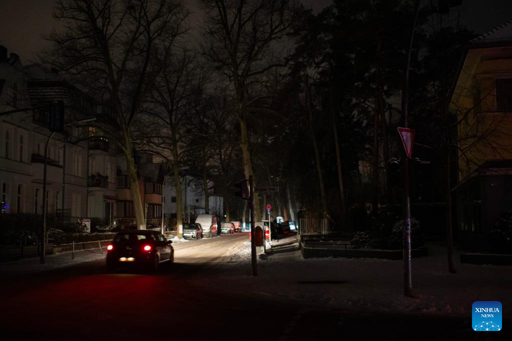 Photo taken on Jan. 6, 2026 shows a street view during a power outage at Nikolassee area in Berlin, Germany. Thousands of households, as well as supermarkets, shops, restaurants and other businesses in southwest Berlin, still remained without power on Tuesday, as crew continued repairs to restore electricity after an attack on the grid left parts of the German capital in the dark for a fourth consecutive day. (Xinhua/Zhang Haofu)