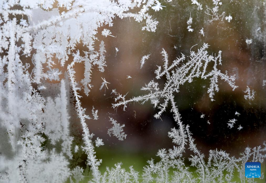 A window with frost is pictured at London Zoo in London, Britain, Jan. 6, 2026. Amber cold weather alerts remain in force for England through Friday, with snow, ice, strong winds and heavy rain expected to bring further hazards later in the week. (Xinhua/Li Ying)