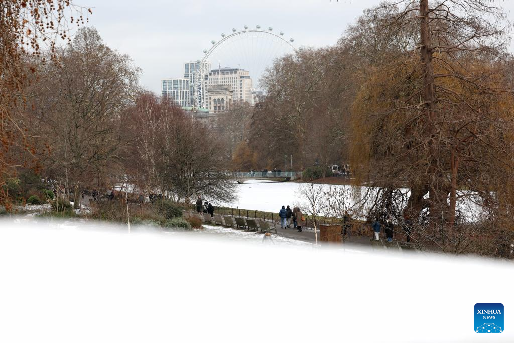 People walk at St. James's Park in London, Britain, Jan. 6, 2026. Amber cold weather alerts remain in force for England through Friday, with snow, ice, strong winds and heavy rain expected to bring further hazards later in the week. (Xinhua/Li Ying)