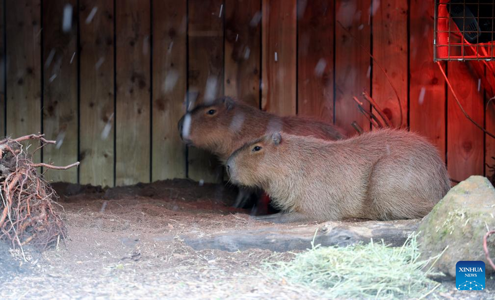 Two capybaras shelter in the snow at London Zoo in London, Britain, Jan. 6, 2026. Amber cold weather alerts remain in force for England through Friday, with snow, ice, strong winds and heavy rain expected to bring further hazards later in the week. (Xinhua/Li Ying)