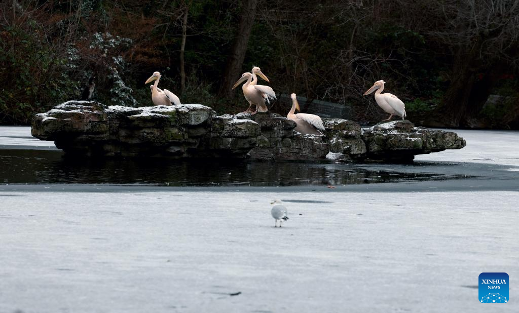 Pelicans are seen on the rocks surrounded by the frozen surface of the lake at St. James's Park in London, Britain, Jan. 6, 2026. Amber cold weather alerts remain in force for England through Friday, with snow, ice, strong winds and heavy rain expected to bring further hazards later in the week. (Xinhua/Li Ying)