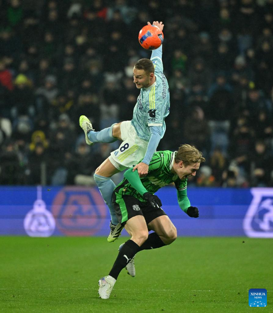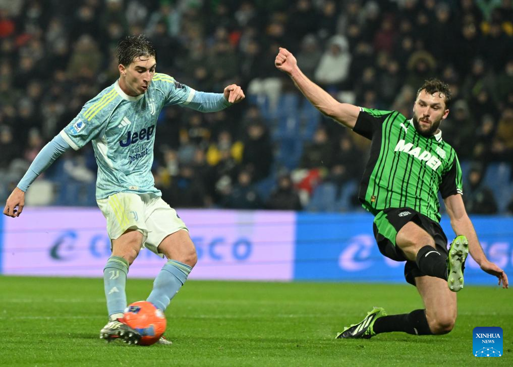 Juventus' Teun Koopmeiners (L) vies with Sassuolo's Andrea Pinamonti during a Serie A football match between Sassuolo and Juventus in Reggio Emilia, Italy, Jan. 6, 2026. (Photo by Alberto Lingria/Xinhua)
