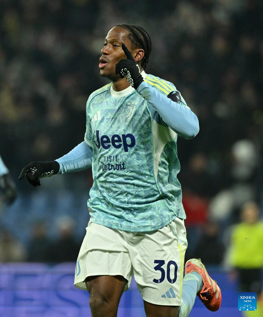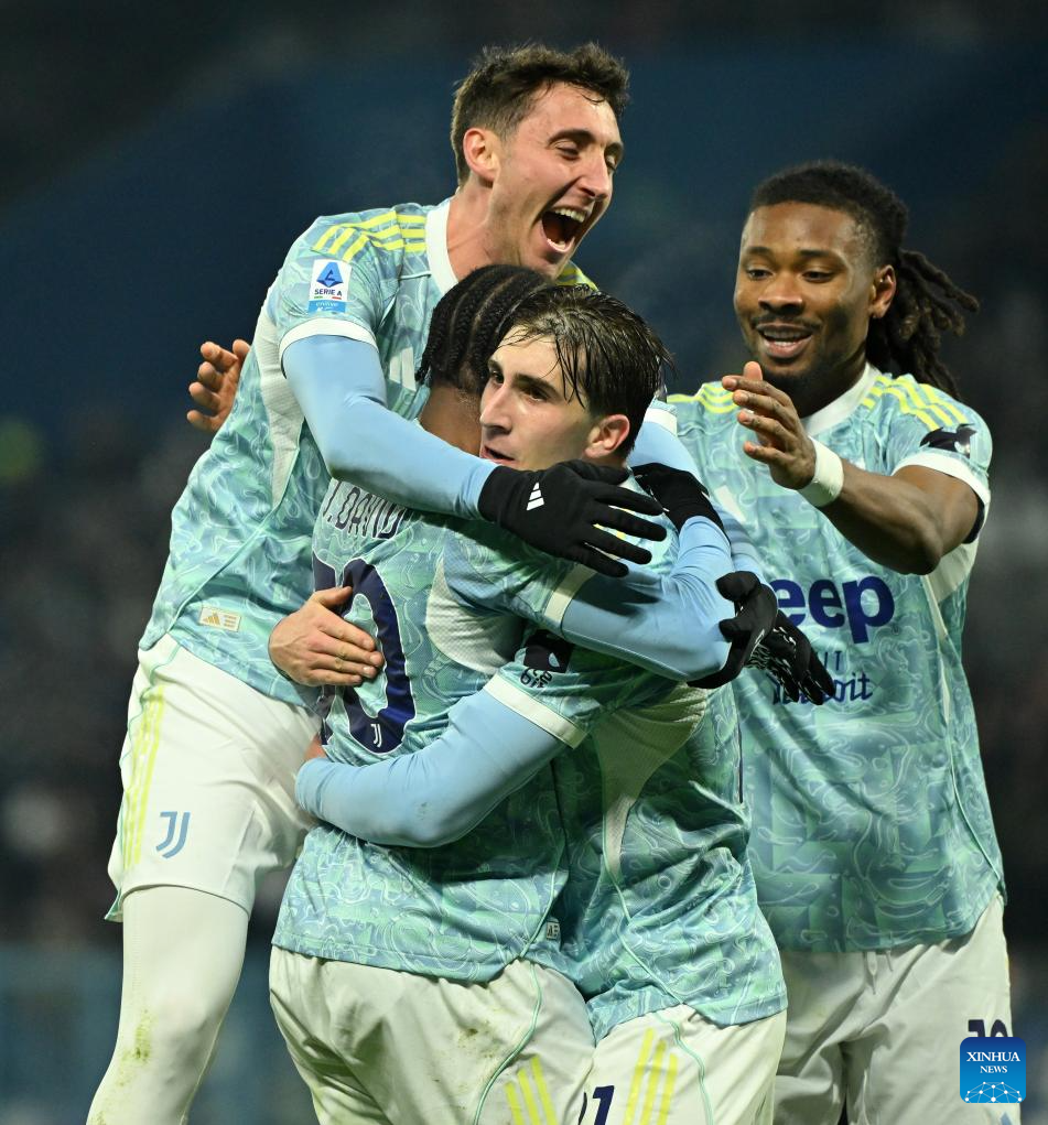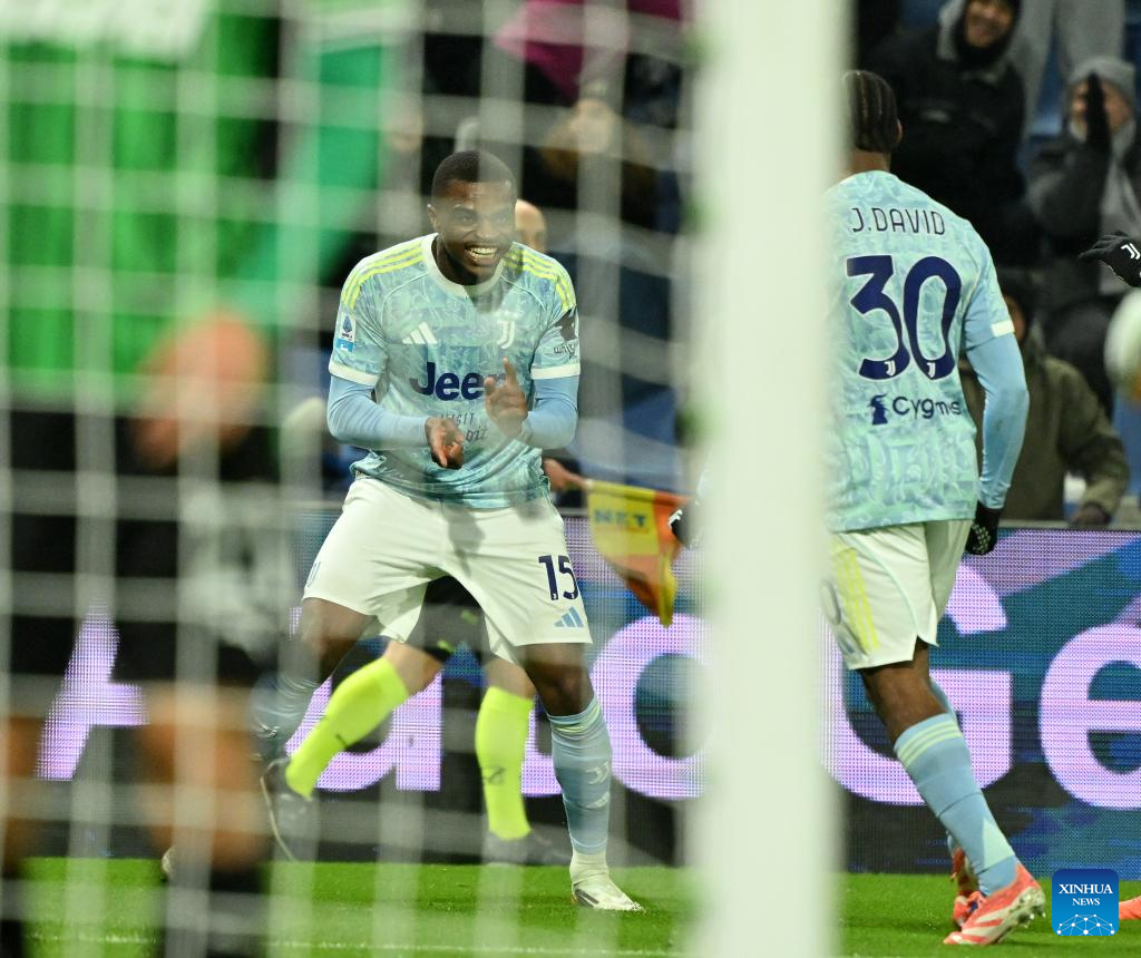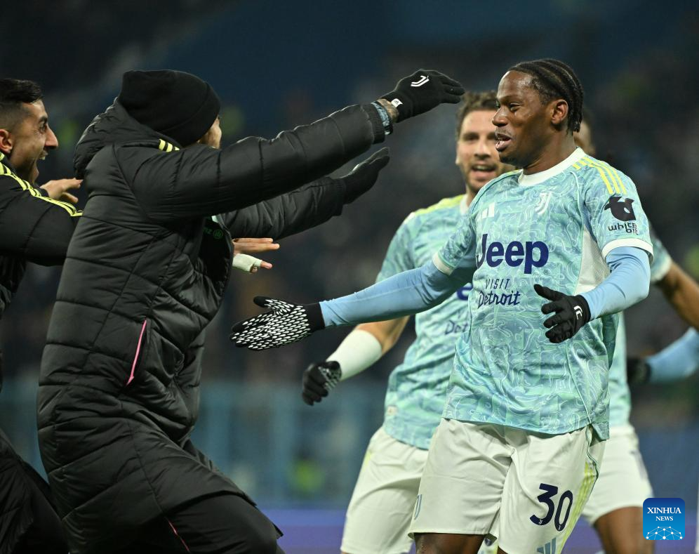 Juventus' Fabio Miretti (2nd R) celebrates his goal with teammates during a Serie A football match between Sassuolo and Juventus in Reggio Emilia, Italy, Jan. 6, 2026. (Photo by Alberto Lingria/Xinhua)