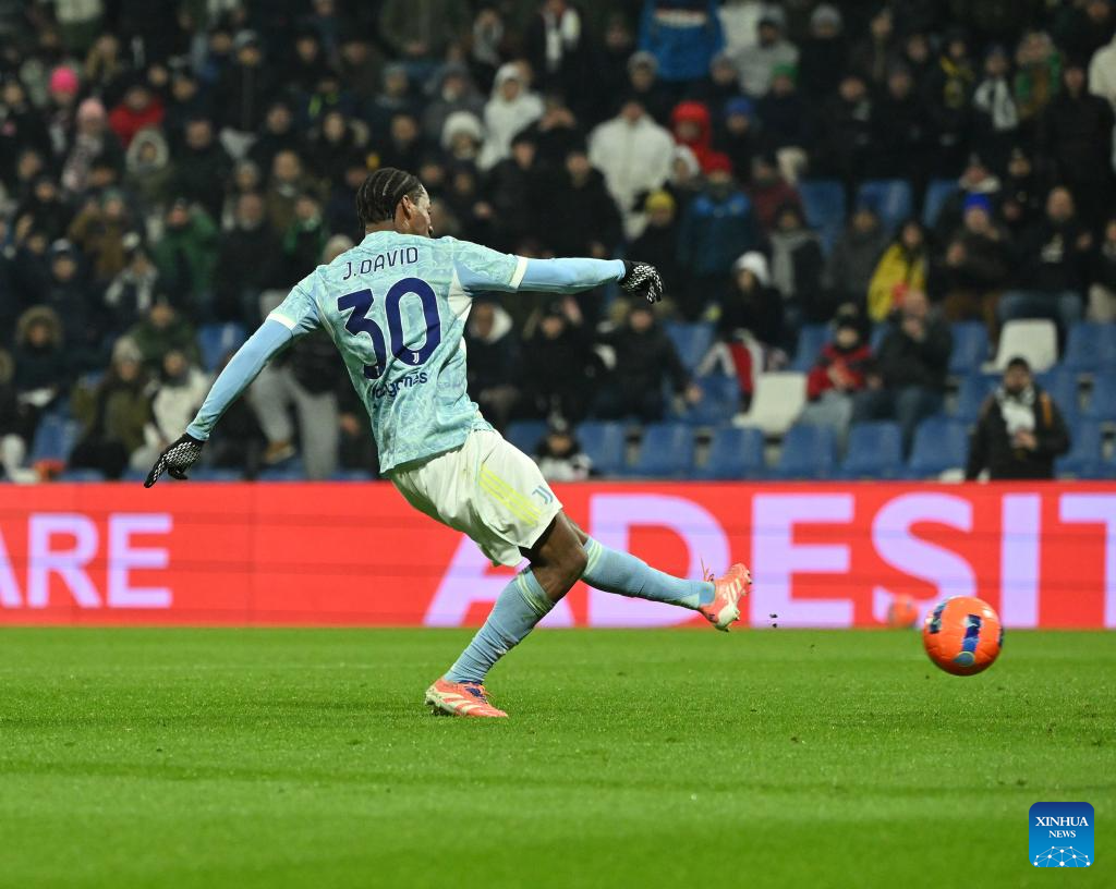 Juventus' Jonathan David scores during a Serie A football match between Sassuolo and Juventus in Reggio Emilia, Italy, Jan. 6, 2026. (Photo by Alberto Lingria/Xinhua)