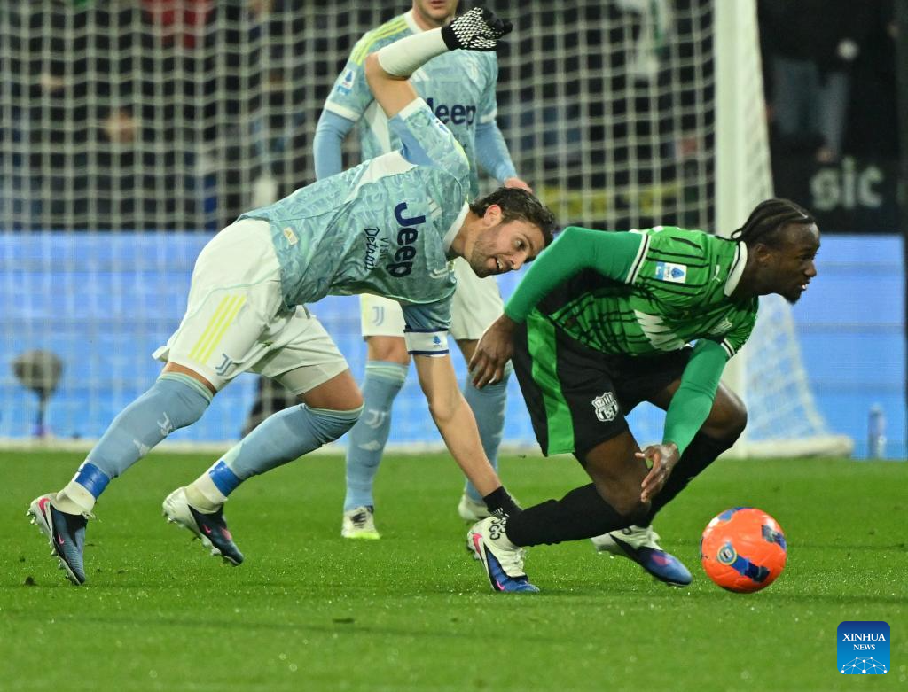 Juventus' Manuel Locatelli (L) vies with Sassuolo's Ismael Kone during a Serie A football match between Sassuolo and Juventus in Reggio Emilia, Italy, Jan. 6, 2026. (Photo by Alberto Lingria/Xinhua)