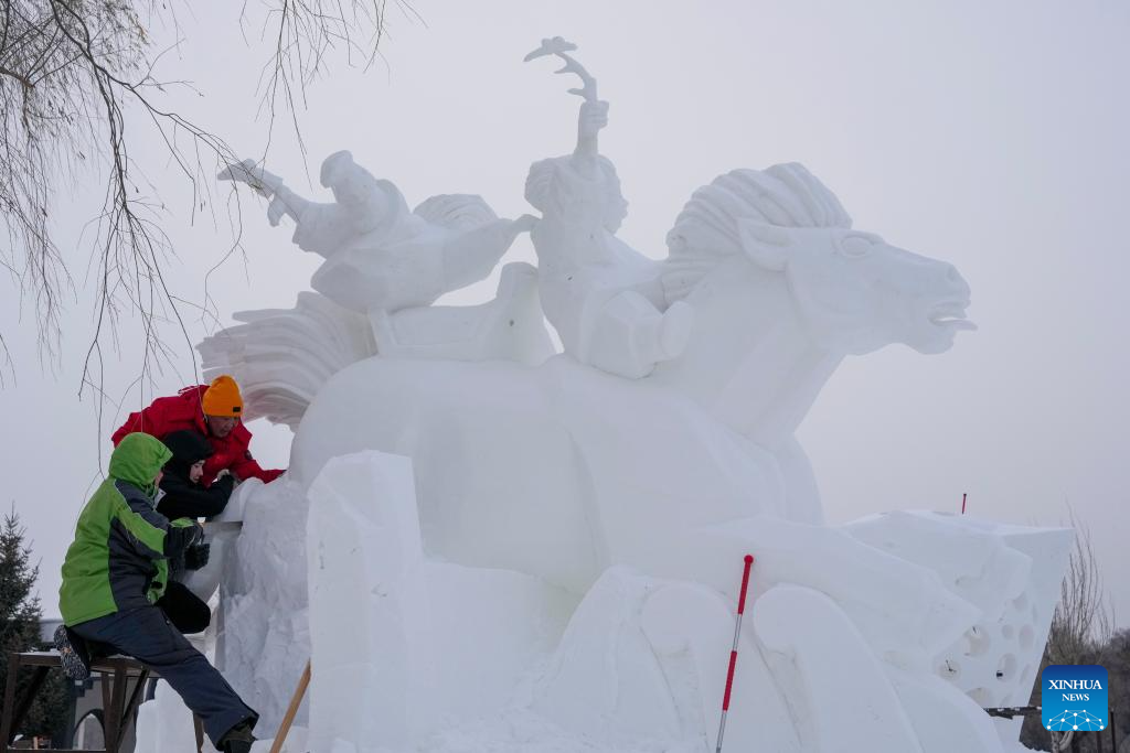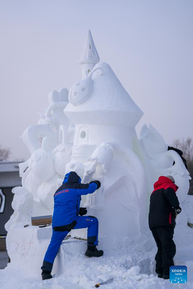 Contestants work on a snow sculpture at the Sun Island International Snow Sculpture Art Expo in Harbin, northeast China's Heilongjiang Province, Jan. 8, 2026. The 28th Harbin international snow sculpture competition kicked off here on Tuesday, attracting 25 teams of snow sculptors from 13 countries. (Xinhua/Wang Jianwei)