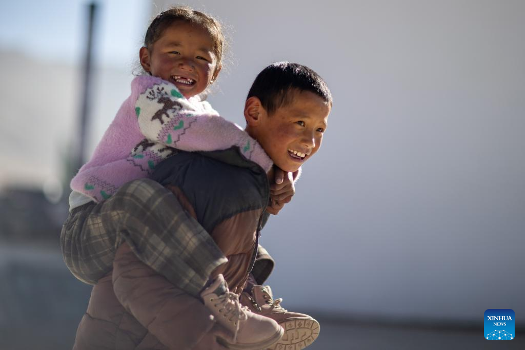 A boy with his sister on his back is pictured at a square in Zimgag Village of Chamco Township, in Dingri County of Xigaze City, southwest China's Xizang Autonomous Region, on Jan. 5, 2026. In January 2025, a 6.8-magnitude earthquake struck Dingri County in the city of Xigaze, leveling thousands of houses.