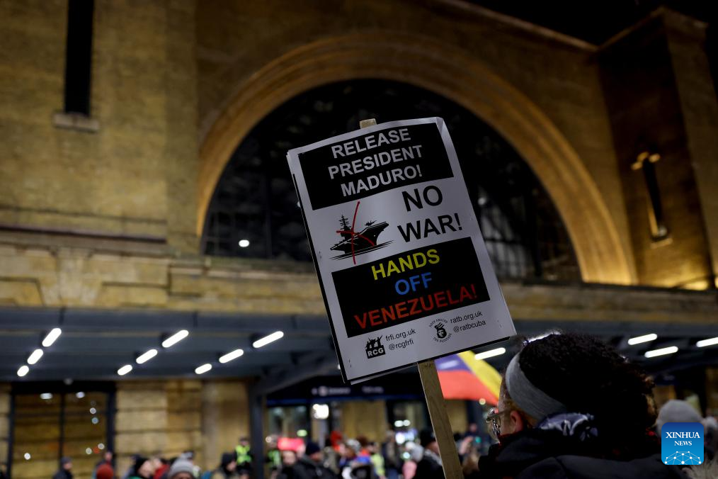 Demonstrators attend a protest condemning U.S. attack on Venezuela outside King's Cross railway station in London, Britain, Jan. 7, 2026. (Xinhua/Li Ying)