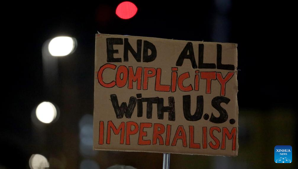 A demonstrator holds a placard during a protest condemning U.S. attack on Venezuela outside King's Cross railway station in London, Britain, Jan. 7, 2026. (Xinhua/Li Ying)