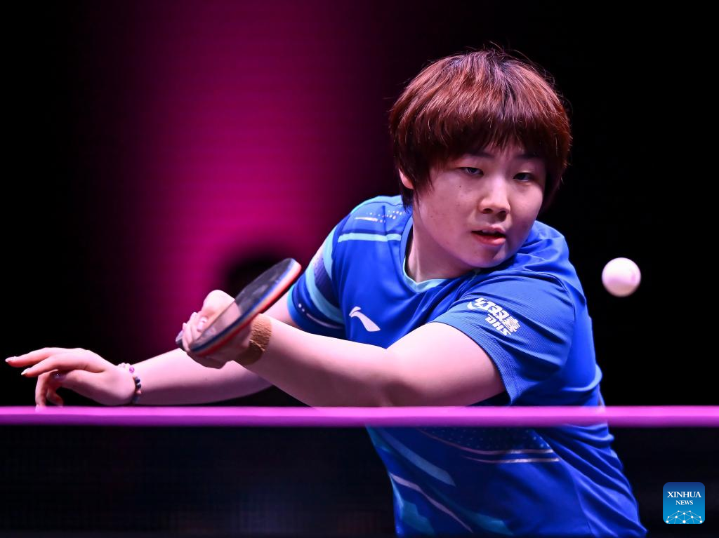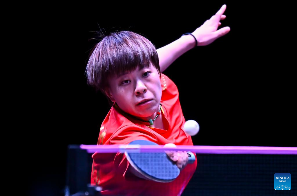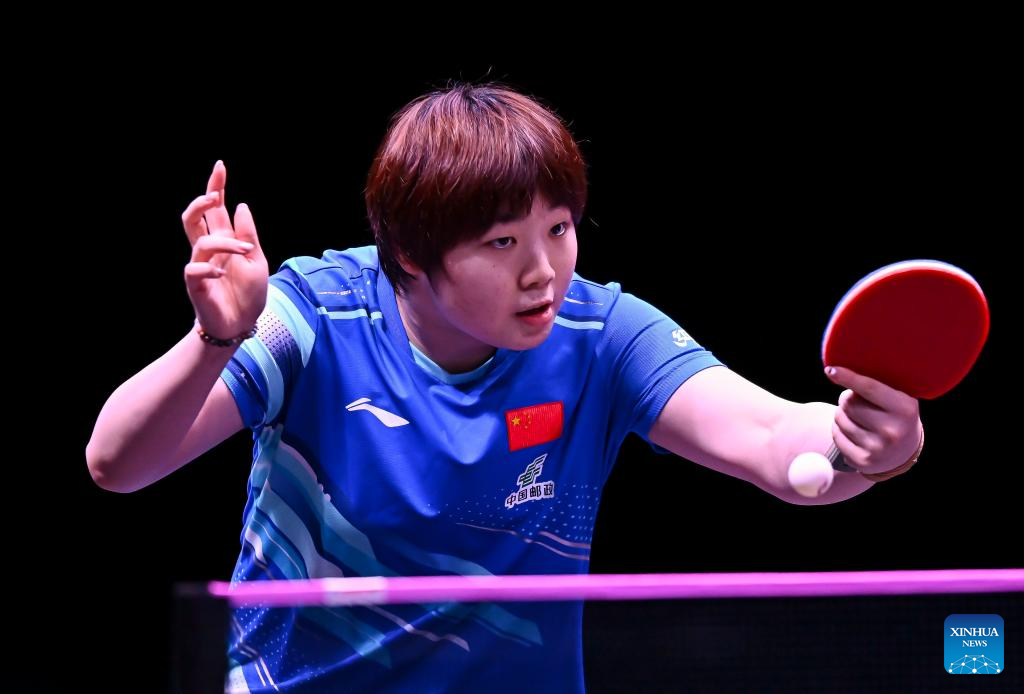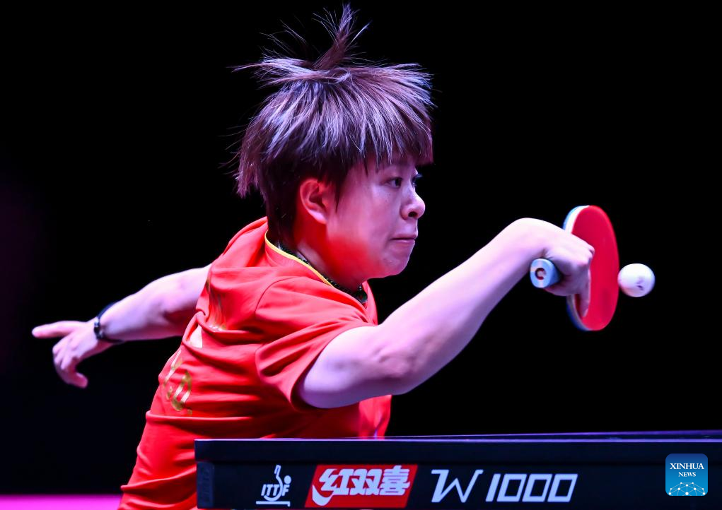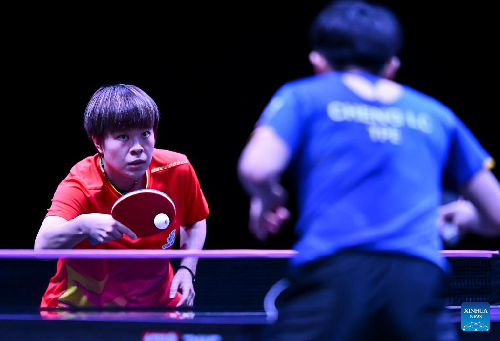 Wang Yidi of China hits a return during the women's singles Round of 32 match against Cheng I-Ching of Chinese Taipei at the WTT Champions Doha 2026 in Doha, Qatar, on Jan. 7, 2026. (Photo by Nikku/Xinhua)