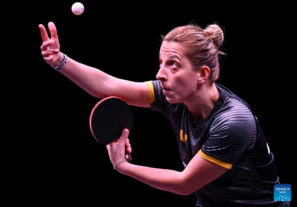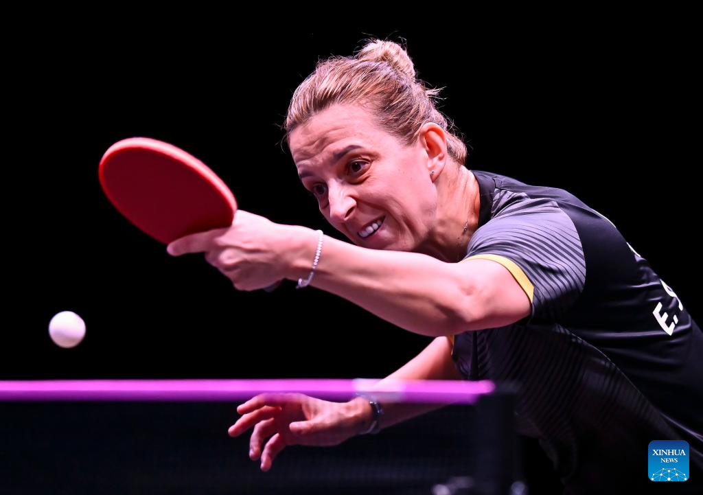 Elizabeta Samara of Romania hits a return during the women's singles Round of 32 match against Kuai Man of China at the WTT Champions Doha 2026 in Doha, Qatar, on Jan. 7, 2026. (Photo by Nikku/Xinhua)