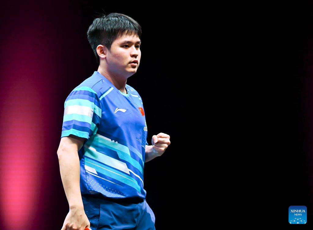 Lin Shidong of China reacts during the men's singles Round of 32 match against Flavien Coton of France at the WTT Champions Doha 2026 in Doha, Qatar, on Jan. 7, 2026. (Photo by Nikku/Xinhua)