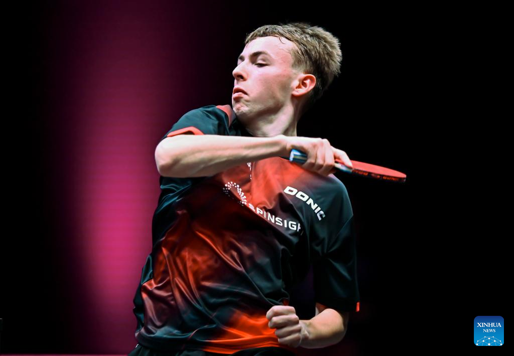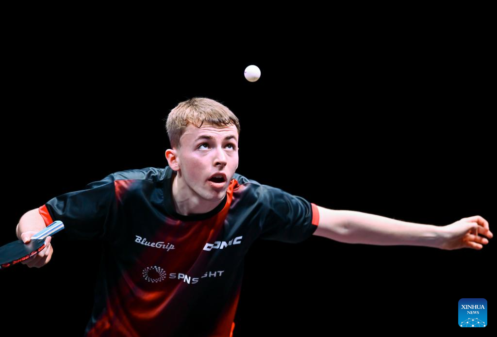 Flavien Coton of France hits a return during the men's singles Round of 32 match against Lin Shidong of China at the WTT Champions Doha 2026 in Doha, Qatar, on Jan. 7, 2026. (Photo by Nikku/Xinhua)