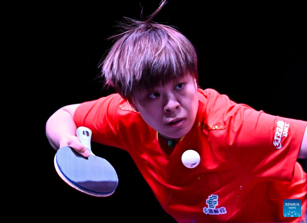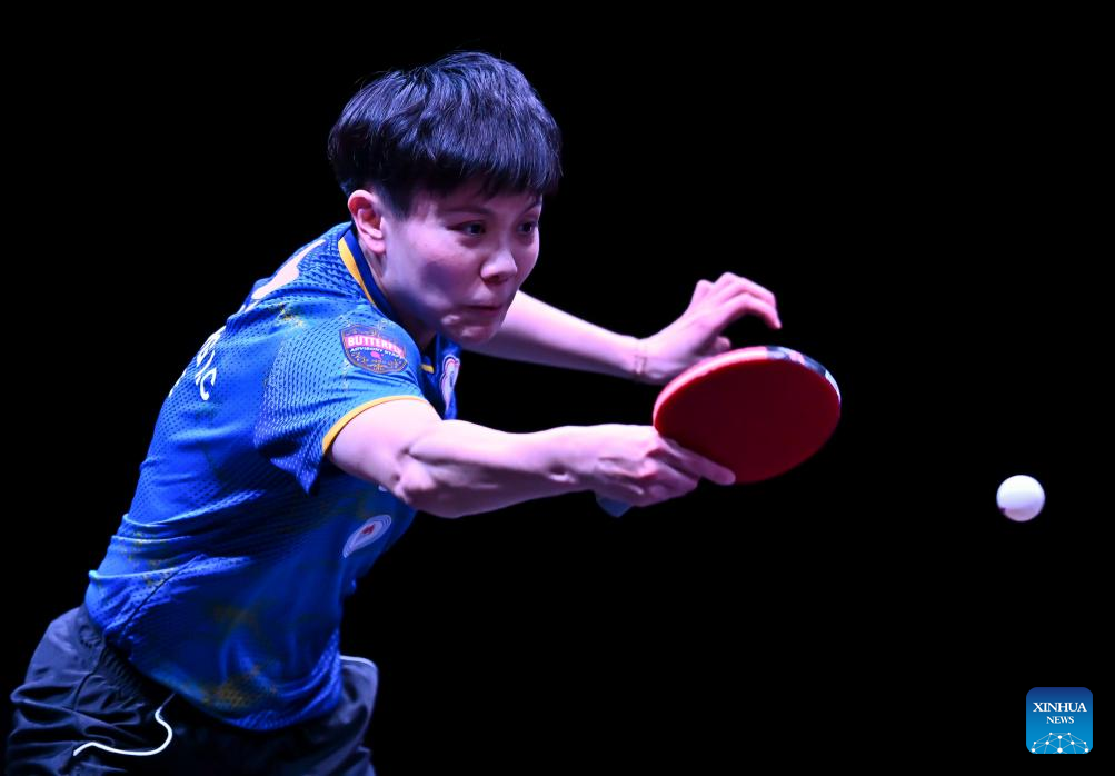 Kuai Man of China hits a return during the women's singles Round of 32 match against Elizabeta Samara of Romania at the WTT Champions Doha 2026 in Doha, Qatar, on Jan. 7, 2026. (Photo by Nikku/Xinhua)