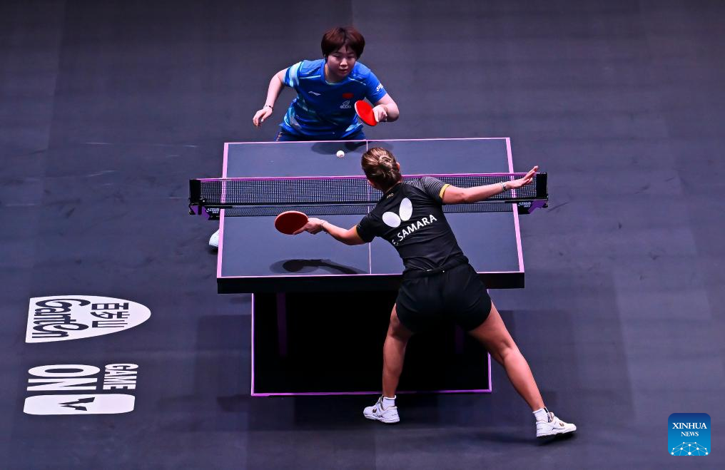 Kuai Man (top) of China hits a return during the women's singles Round of 32 match against Elizabeta Samara of Romania at the WTT Champions Doha 2026 in Doha, Qatar, on Jan. 7, 2026. (Photo by Nikku/Xinhua)