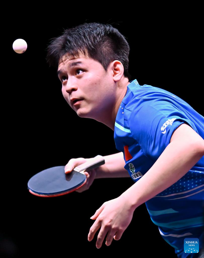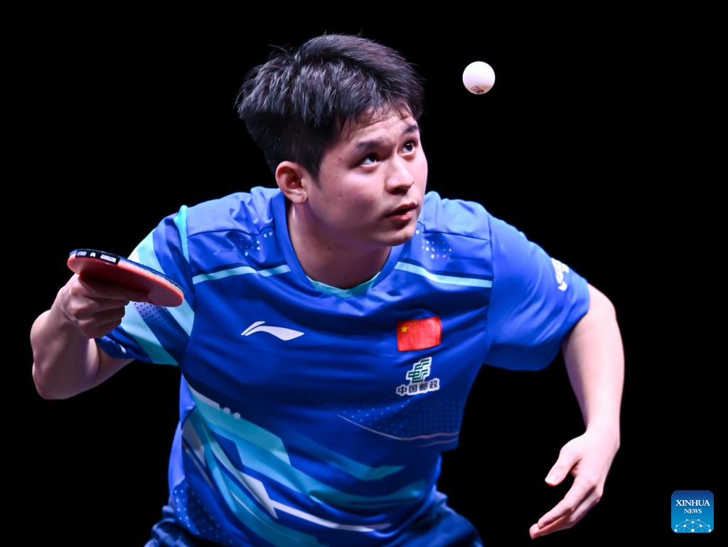 Lin Shidong of China serves during the men's singles Round of 32 match against Flavien Coton of France at the WTT Champions Doha 2026 in Doha, Qatar, on Jan. 7, 2026. (Photo by Nikku/Xinhua)