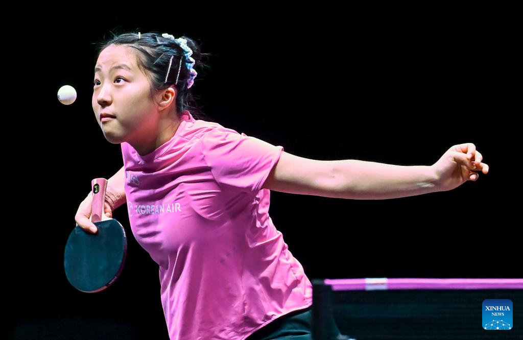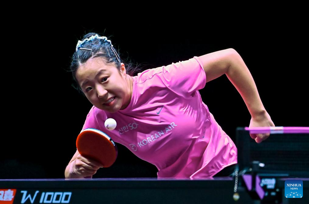 Shin Yubin of South Korea hits a return during the women's singles Round of 32 match against Harimoto Miwa of Japan at the WTT Champions Doha 2026 in Doha, Qatar, on Jan. 7, 2026. (Photo by Nikku/Xinhua)