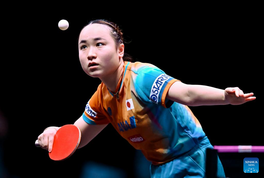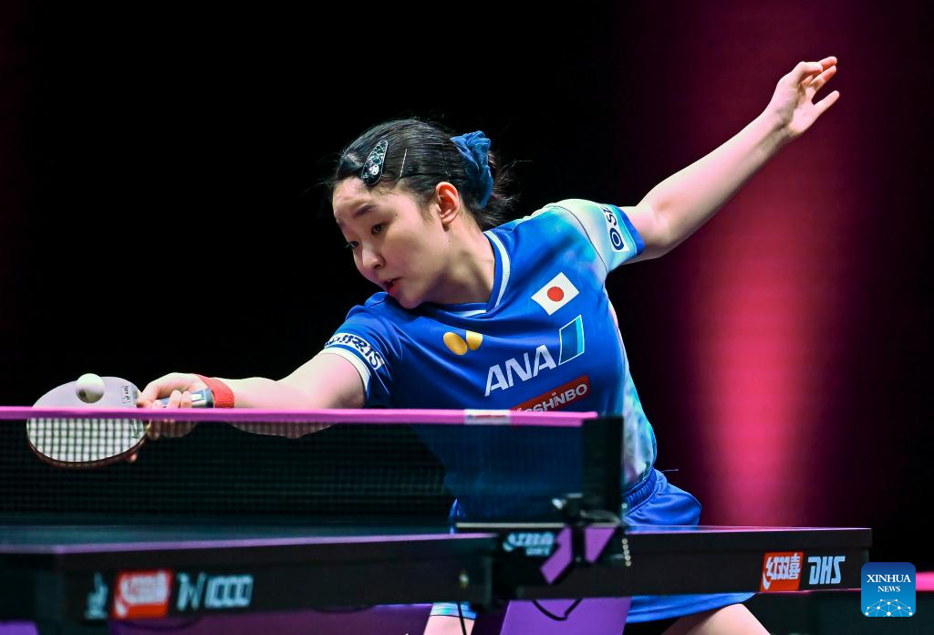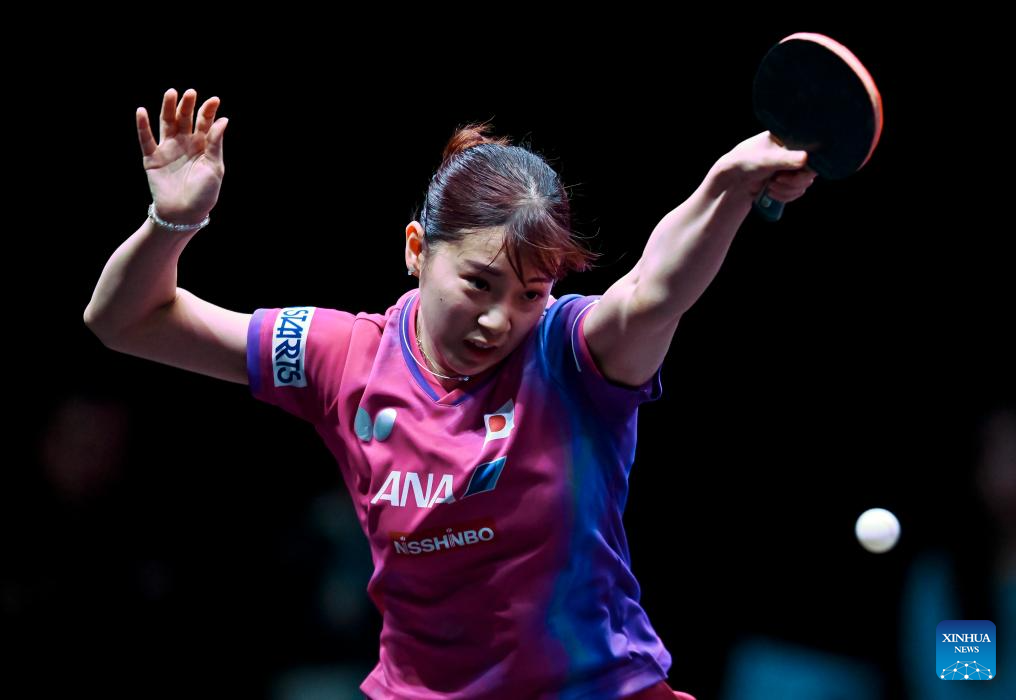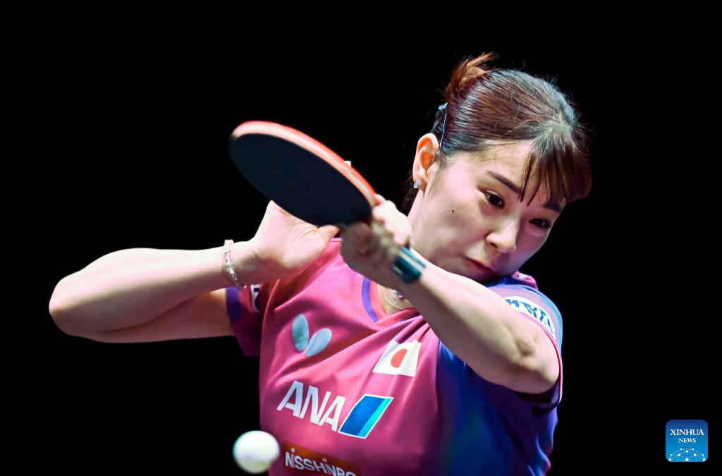 Nagasaki Miyu of Japan hits a return during the women's singles Round of 32 match against Ito Mima of Japan at the WTT Champions Doha 2026 in Doha, Qatar, on Jan. 7, 2026. (Photo by Nikku/Xinhua)