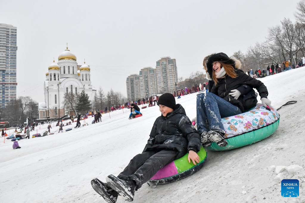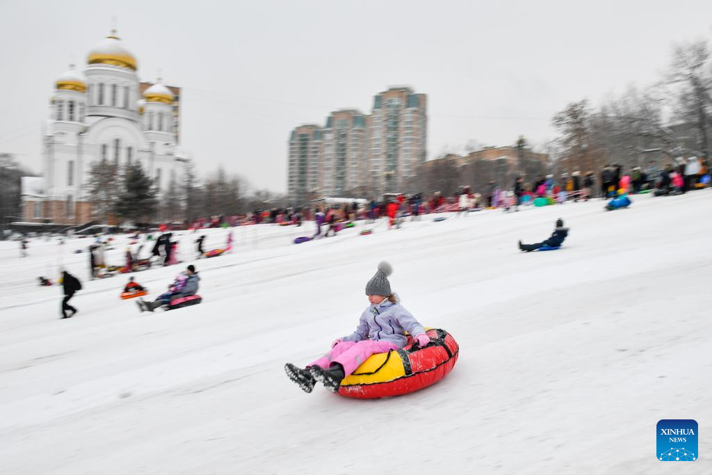 People enjoy sledding in the snow at a park in Moscow, Russia, on Jan. 7, 2026. (Photo by Alexander Zemlianichenko Jr/Xinhua)