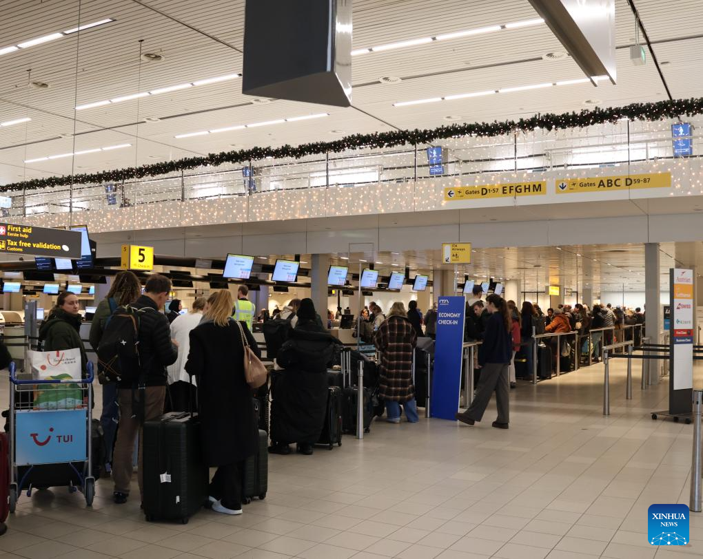 Passengers wait for check-in at Schiphol Airport in Amsterdam, the Netherlands, on Jan. 7, 2026. Persistent winter weather and strong winds severely affected air traffic in the Netherlands. (Photo by Sun Jingjing/Xinhua)